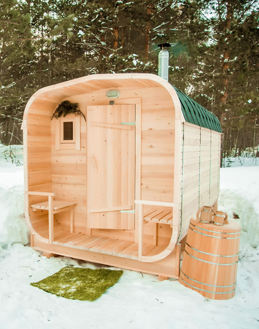 Баня-бочка буханка из кедра с козырьком (все размеры) Баня-буханка более просторная за счет увеличенной высоты потолков и ровного пола. Козырек не только украшает баню, но и защищает оставленную обувь от дождя. Лавочки из кедра находятся по всей длине бани-бочки с обеих сторон. Печь расположена в парилке около дальней стены. Время растопки такой бани не превышает 30 минут. В зависимости от выбранного размера баня-бочка буханка с козырьком имеет следующую комплектацию: Баня-бочка буханка 2,5 метра - парилка; Баня-бочка буханка 3,5 и 4,5 метра - раздевалка, парилка; Баня-бочка буханка 5,5 метров - раздевалка, парилка, моечная. По вашему желанию ее можно укомплектовать печью с внешней загрузкой, благодаря которой весь мусор вовремя топки остается на улице. Баня-бочка буханка не требует полноценный фундамент, поэтому при необходимости ее можно перенести в другое место. Обращаем Ваше внимание, что в стандартную комплектацию бани входят полки открытого типа в парной с обеих сторон. Дополнительно можно заказать полок закрытого типа или лавку! Кедр обладает ароматическими свойствами. Он не деформируется и влагоустойчив, при правильном уходе за деревом на нем не развиваются грибки и плесень.