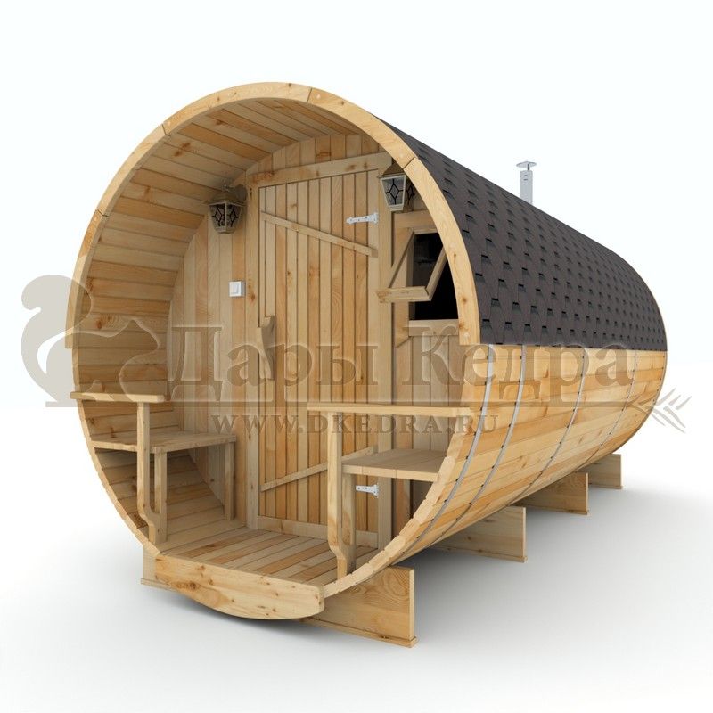 Баня-бочка круглая из кедра 4 метра Это изделие круглой вытянутой формы с двумя отделениями: раздевалкой и парной. Лавочки из кедра находятся по всей длине бани-бочки с обеих сторон. Печь расположена в парилке около дальней стены. Для удобства пользования в раздевалке установлена вешалка и полочка из кедра. За счет небольшой конструкции баня нагревается не более 30 минут. По вашему желанию баню-бочку можно дополнить печью с внешней загрузкой, благодаря которой весь мусор после топки останется на улице. Круглая баня-бочка не требует полноценный фундамент, поэтому при необходимости ее можно перенести в другое место. Обращаем Ваше внимание, что в стандартную комплектацию бани входят лавки в парной с обеих сторон. Дополнительно можно заказать полок открытого или закрытого типа! Кедр обладает ароматическими свойствами. Он не деформируется и влагоустойчив, при правильном уходе за деревом на нем не развиваются грибки и плесень.