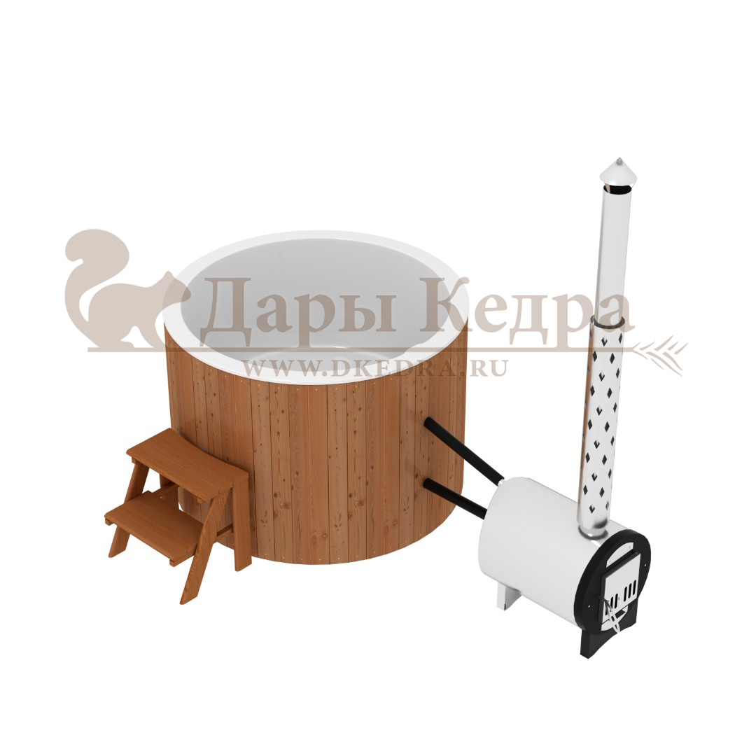 Финская круглая композитная купель с подогревом (с печкой) «Премиум 220 30 квт» Это уличная подогреваемая купель с круглой внутренней чашей, которая изготовлена из современного прочного и термоустойчивого материала (композита). Форма чаши обеспечивает комфортную посадку во время принятия процедур. Для удобства пользования купель фурако оборудована приставной лестницей. Нагрев воды осуществляется за счет встроенной печи, которая находится внутри купели за перегородкой из кедра. В комплектацию этой модели входит савок с длинной ручкой, который позволяет извлекать угли после эксплуатации изделия. Композитная вставка придает купели красивый внешний вид, продлевает срок службы и облегчает уход за изделием. Парение на свежем воздухе – это отличный способ укрепить здоровье и поддержать организм в тонусе.