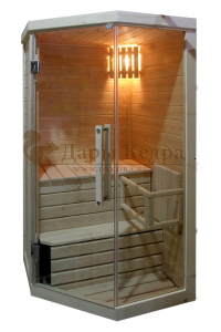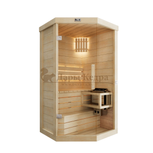 Финская сауна с электрокаменкой представляет собой компактную парную кабину, изготовленную из целебной древесины сибирского кедра. Финская