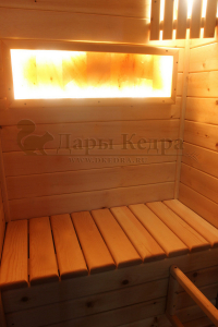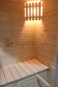 Это специально оборудованная готовая деревянная кабина для сухого и влажного парения. Электропечь нагревает пространство внутри и позволяет сбрызгивать камни водой, слегка увлажняя воздух. Такая процедура позволяет избежать перегрева. Каркас сауны выполнен из массива кедра, снаружи и внутри обшит липовой вагонкой сорта «Экстра» и имеет теплоизоляционный слой. Также двухуровневый полок идёт из кедра для обогащения внутри кабины полезными фитонцидами, а в сочетании с противовирусными свойствами липы сауна становится настоящим источником здоровья.
